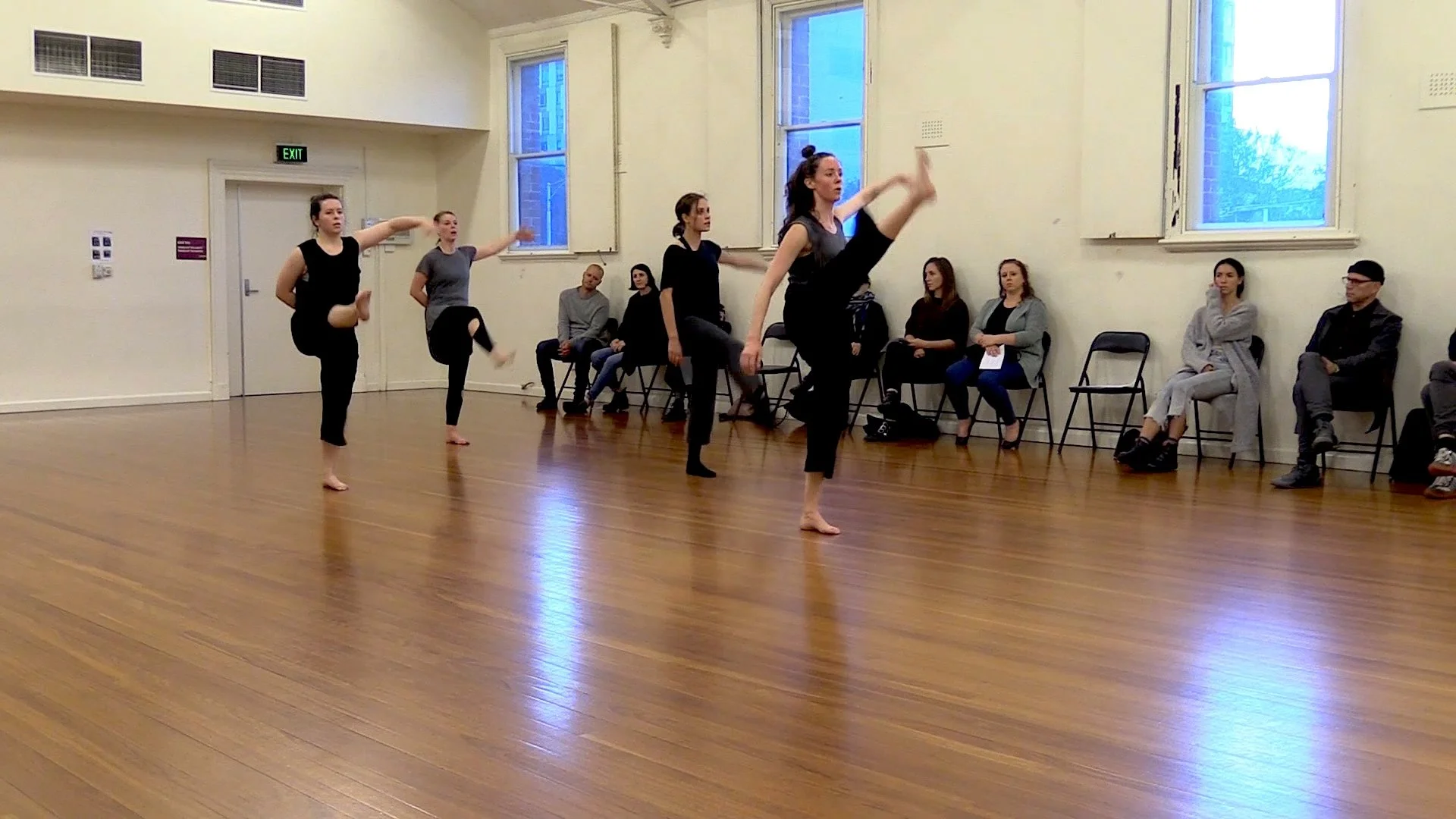 The project culminated in a performance exhibition, Dancing with my multiple bodies presented at Deakin University (Melbourne) in July 2023. It comprised two works: Seven fragments in six loops – a three-hour live performance, and Twenty-four moments in six minutes – a six-minute dance film that was played on loop for the duration of the performance exhibition. These two works emerged as translations of the works of Kuniko Kato, Tehching Hsieh, and Deborah Hay and Motion Bank, and were grounded in repetition and multiplicity – of bodies, structures, time, and fragmented dances.